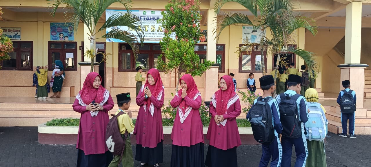 Dengan penuh keakraban, para guru berjabat tangan dengan setiap siswa yang datang. Ucapan salam dan sapaan lembut menjadi awal hari yang menumbuhkan rasa kedekatan antara guru dan peserta didik. Para siswa pun terlihat antusias dan bersemangat. Mereka membalas salam dengan senyum cerah, menandakan kesiapan mereka menimba ilmu di madrasah tercinta.
